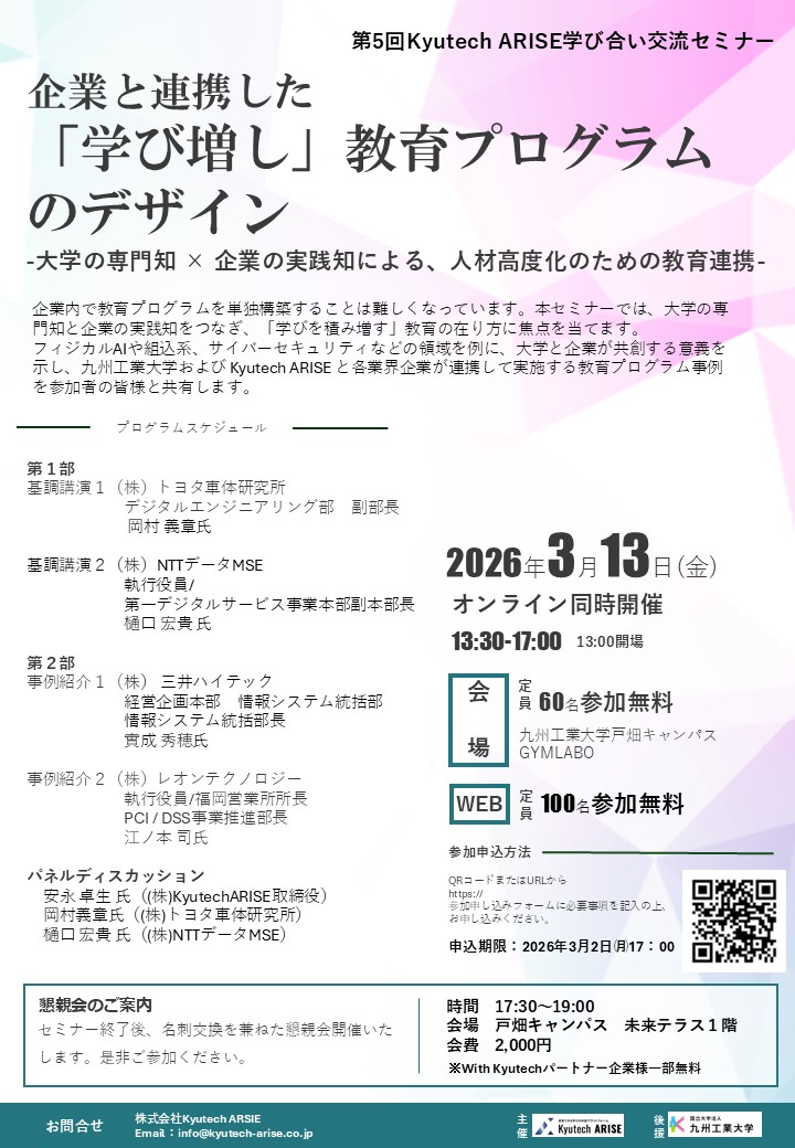 下記のとおり、株式会社Kyutech ARISE 主催 学び合い交流セミナーを開催いたします。