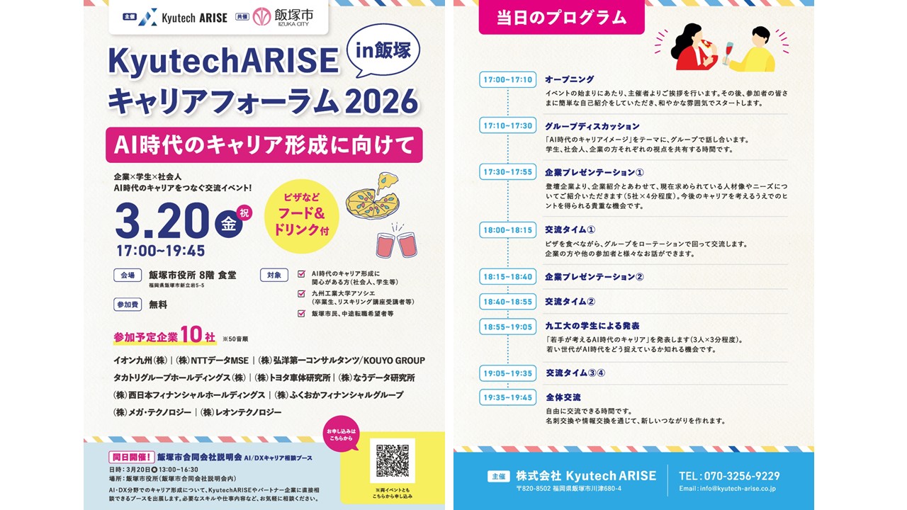 下記のとおり、株式会社Kyutech ARISE 主催 Kyutech ARISEキャリアフォーラム2026 in飯塚 を開催いたします。